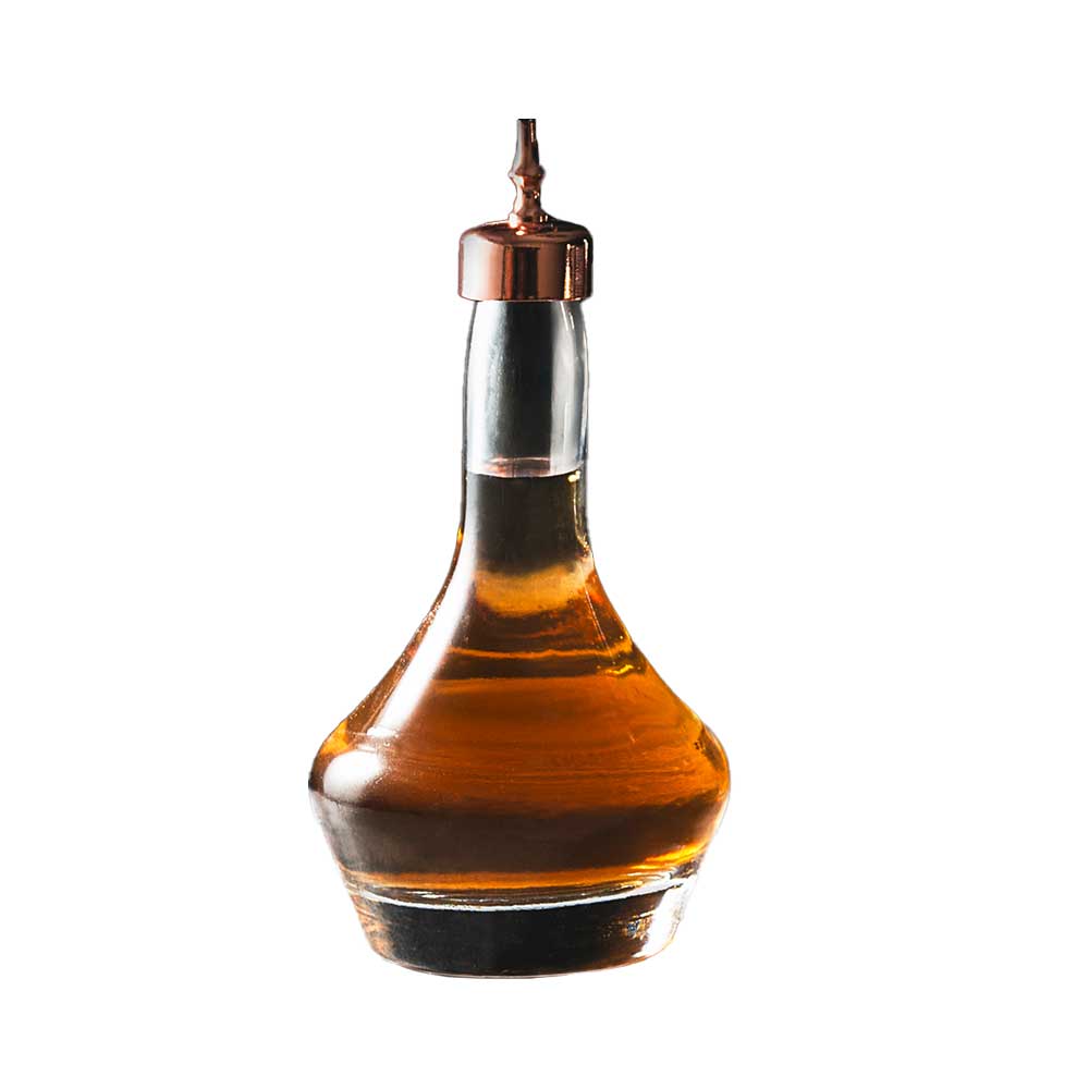 Bitters Bottle Copper Top 3.5 Oz is a crafted piece designed for precision and style in serving bitters. This bitters bottle features a copper top, adding a touch of elegance and sophistication to any bar setting. With a capacity of 3.5 ounces, it is perfectly sized for holding and dispensing bitters, enhancing the efficiency of cocktail preparation. Standing at a height of 5-3/4 inches, this bottle is constructed from soda lime glass, offering clarity and durability. Its combination of functional design and aesthetic appeal makes it a valuable tool for professional bartenders and cocktail enthusiasts alike, providing both reliability and a touch of class to any mixology setup.