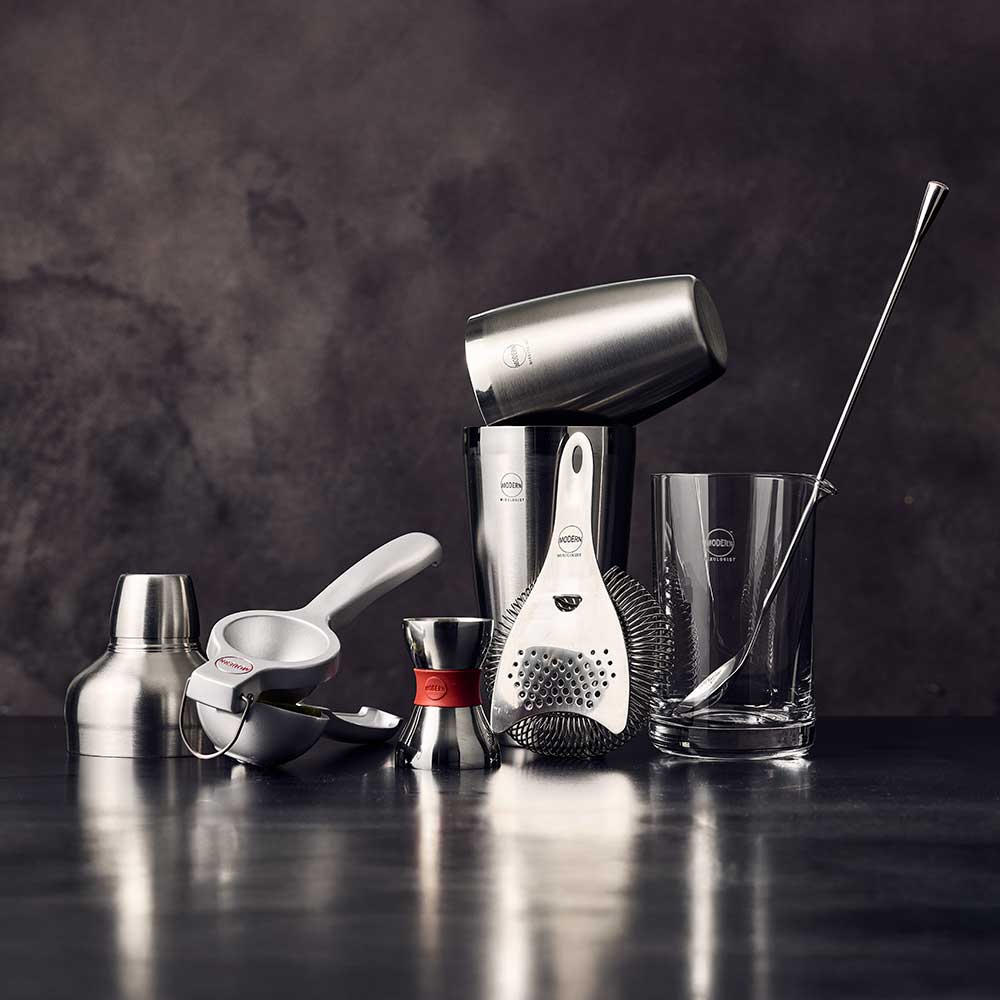 This set includes: Large Boston Shaker, Shaker Cup, Hawthorne Strainer, Juicer, Jigger, Mixing Beaker, 24° Straight Cocktail Spoon and Cobbler Shaker Top.
